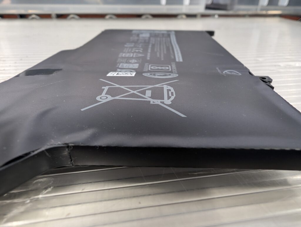 取り外したバッテリーは、側面から見ると大きく膨らんでいるのがはっきりと分かります。