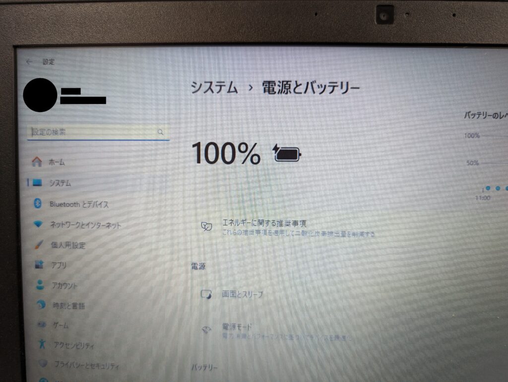 交換後、動作確認を行ったところ、ACアダプタを外した状態でも正常に駆動し、Windowsの設定画面上でも100%まで問題なく充電されることを確認しました。